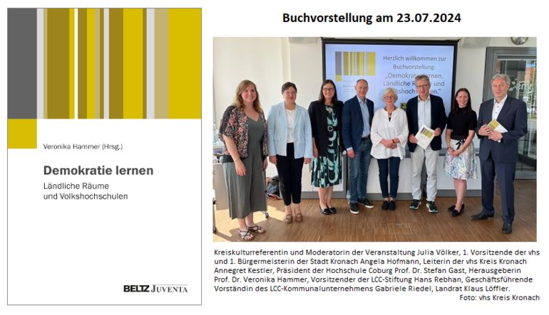 Das Buch „Demokratie lernen. Ländliche Räume und Volkshochschulen.“, herausgegeben von Frau Prof. Dr. Hammer, Beisitzerin im vhs-Vorstand, ist nach intensiver Vorarbeit am 19. Juni 2024 erschienen.