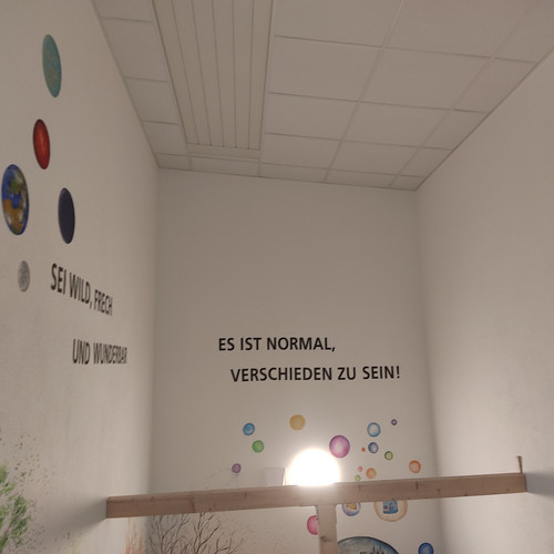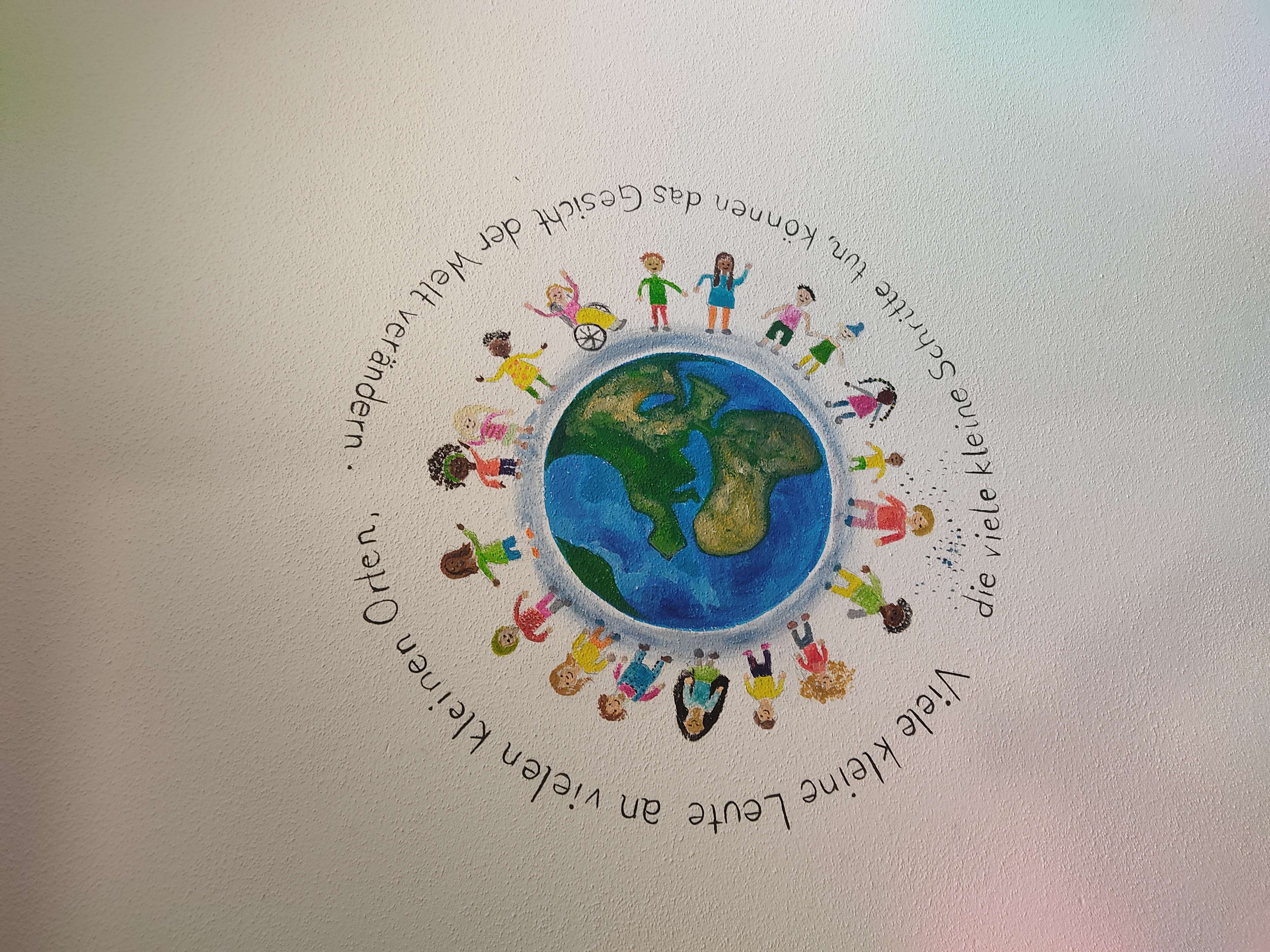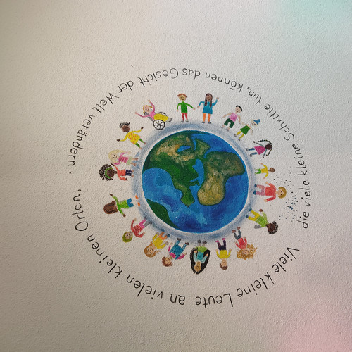 Schülerinnen der 5. bis 10. Klasse haben das neue Treppenhaus des Kath. integrativen Montessori Kindergartens Dörfles zum Thema "Vielfalt und Akzeptanz" nach eigenen Skizzen und Entwürfen gestaltet. Dies ist als Teamarbeit und in demokratischen Prozessen vorbereitet und durchgeführt worden. So entstand ein einzigartiges Kunstwerk, von dem Dritte profitieren. Das bleibende Kunstwerk bietet dem Kindergarten (Kindern, Mitarbeitern, Eltern) die Möglichkeit, sich täglich und immer wieder speziell mit dem Thema "Vielfalt und Akzeptanz" auseinanderzusetzen. Bei diesem Kunstprojekt war die Fantasie der Schülerinnen gefragt. Sie setzen damit mehrdimensional ein Zeichen für Vielfalt, Akzeptanz, Demokratie und friedliches Zusammenleben. Die Mädchen wurden unterstützt von Kunstpädagogin Mirjam Gwosdek, Dipl.-Designerin FH.