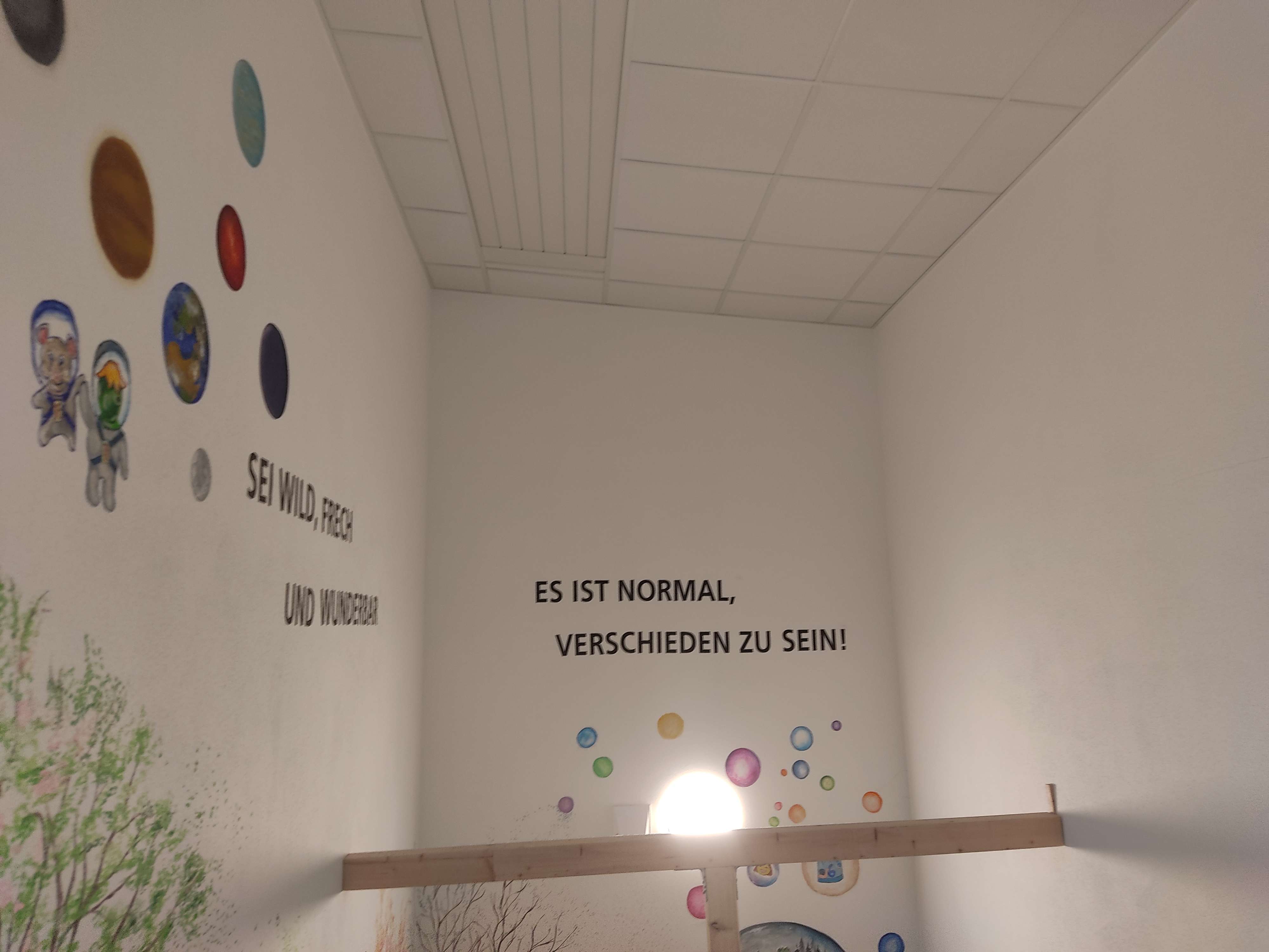 Ein besonderer Dank gilt auch dem Malerbetrieb Schleicher. Dieser stellte ein Gerüst zur Verfügung, das den Mädchen ermöglichte, die hohen Wände sicher und mit viel Spaß zu erreichen. Denn bei all dem künstlerischen Schaffen stand eines im Vordergrund – das gemeinsame Erleben von Demokratie und Vielfalt sowie die Freude beim Malen und Gestalten! Das Projekt wurde mit viel Herz und Engagement verwirklicht, der Enthusiasmus war ansteckend und die Begeisterung der Mädchen war unübersehbar. „Es hat so viel Freude gemacht, die Entstehung eines wunderbaren Etwas zu begleiten“, sagte Erzieherin Mirjam Kapfhammer mit einem strahlenden Lächeln. Die bunten Bilder an unseren Wänden erzählen nun von Träumen, Freundschaft und Abenteuerlust – Worte und Motive, die nicht nur die Räume erhellen, sondern auch die Herzen der Kinder. Es ist beeindruckend zu sehen, wie viel Kreativität und Teamgeist in den Künstlerinnen steckt – und dass sie in der Lage sind, ihr Umfeld aktiv mitzugestalten.